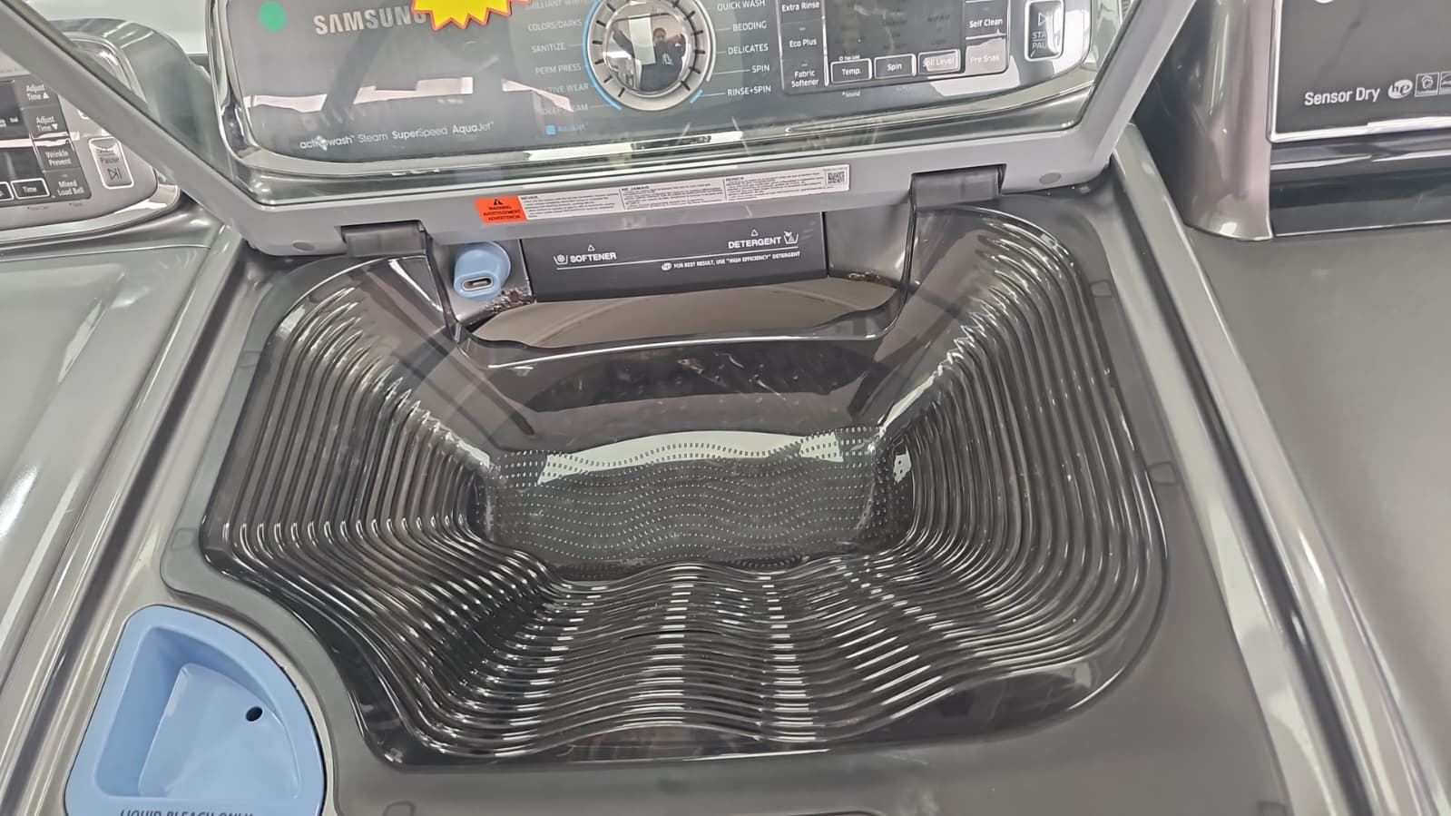 Multiple wash cycles include heavy-duty, bedding, delicates, and quick wash. The diamond drum design protects fabrics while delivering a deep clean.