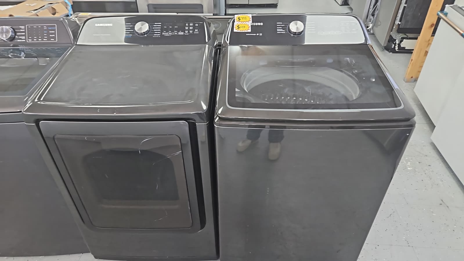 The Samsung WA54R7200AV and DVE50R5400V laundry pair delivers a powerful, stylish solution for modern homes. With a bold black stainless steel finish, this set adds a sleek, premium look to any laundry space.